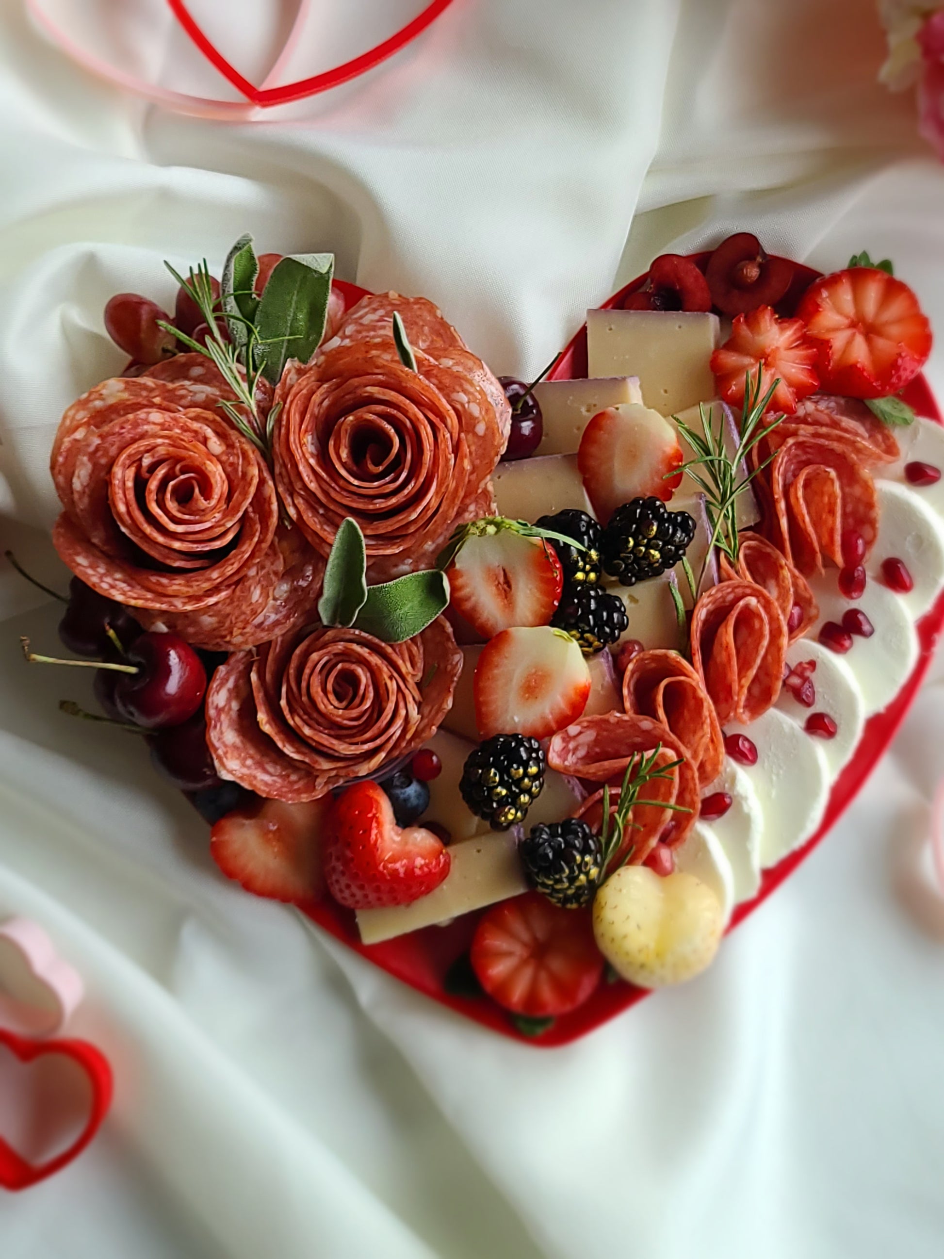 Made with love, this heart-shaped arrangement is artfully crafted with a mix of artisan cheese, premium charcuterie, and is filled with sweet accompaniments. This melamine red heart plate is yours to keep. Perfect for a romantic date night!